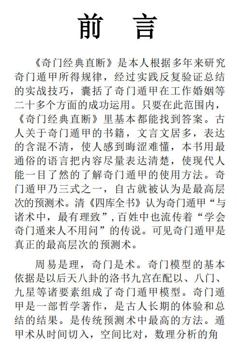 《奇门经典直断》是本人根据多年来研究 奇门遁甲所得规律,经过实践反复验证总结 的实战技巧,囊括了奇门遁甲在工作婚姻等  二十多个方面的成功运用。