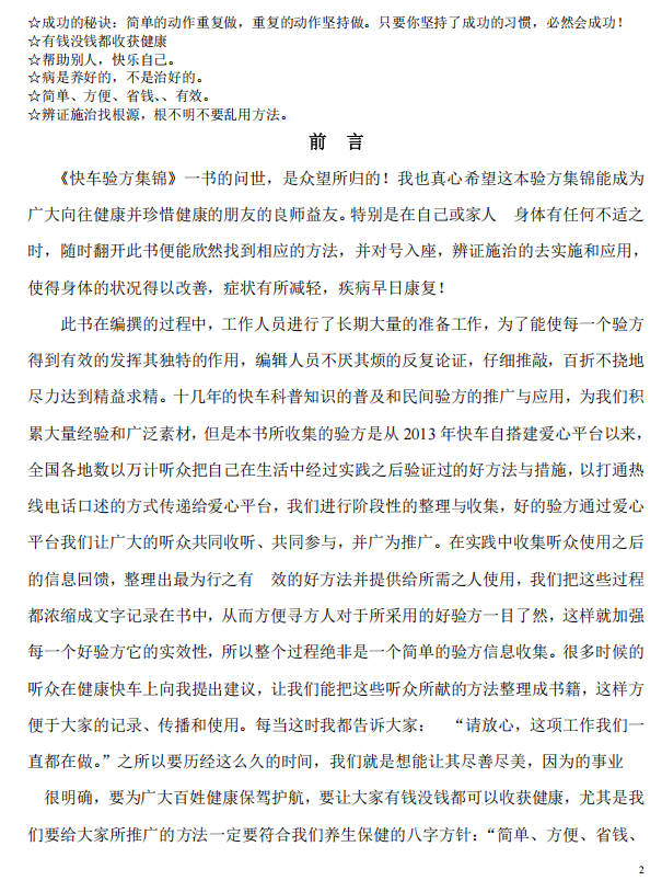 本书所收集的验方是从2013年快车自搭建爱心平台以来,全国各地数以万计听众把自己在生活中经过实践之后验证过的好方法与措施。