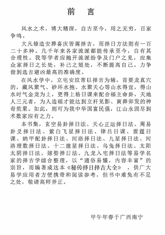 本书集玄空易卦择日法、 天心正运择日法、 周易卦交择日法、 紫白飞星择日法、 律吕日课、 雷霆日课、 纳甲配卦择日法、 河洛择日法、 九星择日法、 河洛理数择日法、 十二建星择日法、 乌兔择日法、 太阳太阴择日法、 嫁娶择日法、 九龙入宅择日法等。