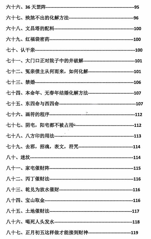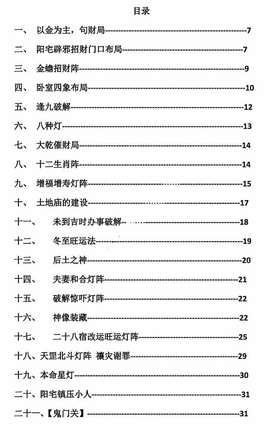 内容涵盖丰富:从以金为主局的聚财法、阳宅避邪招财布局,到金蟾招财阵、卧室四象布局等各类风水阵;还有逢九破解、八种灯法、十二生肖阵等民俗技巧,更涉及婚丧嫁娶、佛教守护、躲星作用等文化知识,从生活实用到文化溯源,全方位呈现民间布局智慧。